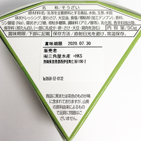 | 原材料名 | 乳等を主要原材料とする食品、水飴、玉ねぎ、半固体状ドレッシング、茎わさび、大豆油、食塩/増粘剤(加工デンプン)、香料、リン酸塩(Na)、環状オリゴ糖、増粘多糖類、調味料(アミノ酸等)、乳化剤、香辛料抽出物、保存料(核たん白)、(一部に乳化剤、卵、さけ、大豆、鶏肉を含む) |
