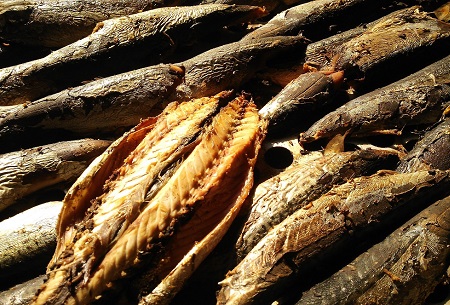 沼津港で水揚げされたサバを蒸して、冷まして、燻して、その後天日と機械で乾燥を繰り返します。この工程はサバ節と同様ですが独自の製法により手間暇掛けて素材の良さと燻製の旨みを最大に活かしています。