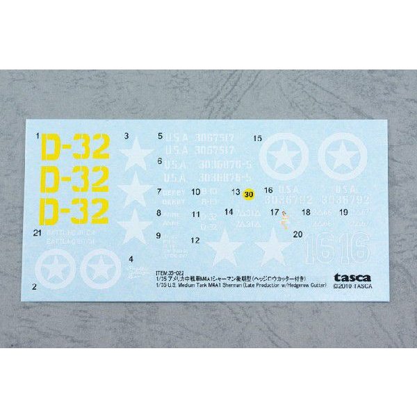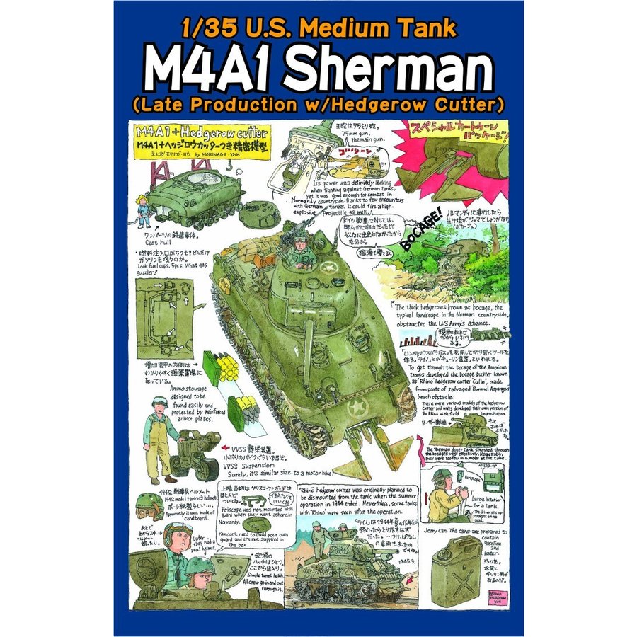 〈M4A1シャーマン後期型について〉M4A1はM4シリーズの中でも最も早く1942年2月から量産が開始され、ロンメル率いるドイツアフリカ軍団と対峙するイギリス軍に最初に供与されました。前線に投入されたシャーマンは機械的信頼性の高さや整備性の良さなど堅実な造りが高く評価されました。しかし、その一方防御力の不足や被弾時の発火などが問題とされました。生産中に改良と変更が行われ、防盾は幅の狭いM34砲架から防盾を砲架の横幅いっぱいまで広げたM34A1砲架に変更され、車体の弾薬庫を防御するため増加装甲が取り付けられました。この他砲身のトラベルクランプの装備やサンドシールドの取り付け方法の変更など細部の仕様が順次変更されていきました。またM4とほぼ共通のシャーシは当初リベット留めによる接合が行われましたが、のちに溶接工法に変更になりました。車体の改良は新規生産に車体以外にも前線から回収される旧型車体にも行われ、その装備のバリエーションは多数を極めました。戦争後半になると、対戦車戦闘向けとして76mm砲塔装備の新型 M4A1(76)W が配備されはじめましたが、75mm砲塔型は76mm砲型よりも榴弾の炸薬量が多いメリットを生かして歩兵支援などの任務が主体となっていきました。またM32戦車回収車、カリオペなどのロケットランチャーの車台として流用されたり、またはドーザーなどの装備を追加されるなどして様々な任務で活用され、終戦まで奮闘しつづけたのです。〈ヘッジロウカッターについて〉ノルマンディ上陸作戦は綿密に計画が練られ、様々な障害に対する対策が事前に準備されましたが、上陸した連合軍にとって思わぬ障害となったのが、ボカージュと呼ばれる生垣でした。農地の境目などに縦横に存在するボカージュは進軍の妨げとなったばかりでなく、防御側のドイツ軍にも天然の防壁として利用され、看過できない問題となったのです。これを突破する為に考案されたのがヘッジロウカッターです。上陸後のあり合わせの機材を使用して製作されたヘッジロウカッターは様々なバリエーションがありました。この製品に付属するヘッジロウカッターはイカの頭のような突起が左右にある本格的な構造のもので、数多くの装着例を見ることができます。三角の大きさや、補強材の構造、中央の突起の本数などに多くの差異がみられます。ノルマンディの戦いの後、大きく重いヘッジロウカッターは取り外すように指示が出されましたが、戦争後半になっても装着したままの車輛も見受けられました。| メーカー品番 | 35-022 |
