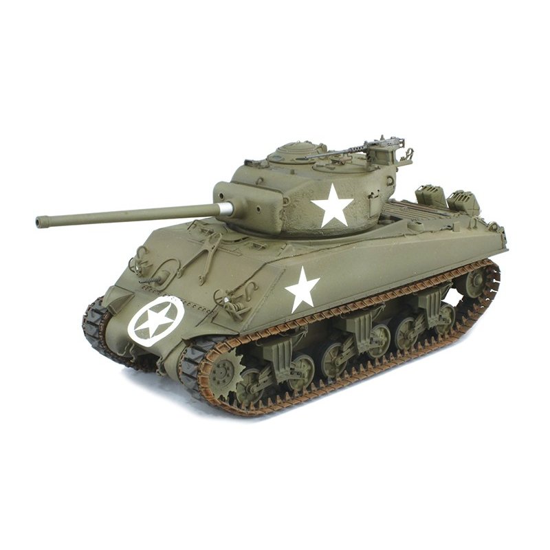 〈M4A3 (76)Wシャーマンについて〉M4シャーマンは1942年の出現当時にはドイツの4号戦車とほぼ互角の性能を有し、機械的信頼性の高さと量産向きのシンプルな構造で大量生産され、大戦中期には連合軍の標準戦車としての役目を担っていました。シンプルな車体は内部容積の拡大などには貢献しましたが、反面で被弾時の弾薬の誘爆などによる破壊も頻発し、車体の改修も課題となりました。そこで防御上の問題点とされたドライバーズフードの出っ張りを無くして前面装甲を一枚板として再設計し、弾薬箱の周囲を水で囲うことによって被弾時の誘爆を防ぐ処置が施されました。この湿式弾庫をを有する新車体のM4シャーマンには形式名の後に「W」を冠して旧型車体と区別されました。一方でドイツ軍がパンターやティーガーなどの新鋭戦車を戦線に投入すると、従来の75mm砲の劣勢は明らかとなり、対戦車戦闘力を向上させた高初速の戦車砲の搭載が計画されました。こうして開発された76mm砲は後座量の増大に伴って完全に新設計された砲塔に搭載されることになったのです。またフォード製ガソリンエンジンを搭載するM4A3はガソリンエンジン搭載車としては最も優れているとの評価を得、アメリカ軍向けの主力として量産されました。このような経緯もあり、76mm砲型の量産はM4A1とM4A2(ソ連向け)、M4A3に絞られることになりました。こうして76mm砲型のシャーマンはまずM4A1の後期車体に搭載され、続いてM4A3の後期車体にも搭載されて量産が開始されたのです。M4A3(76)Wの量産は1944年3月から開始されましたが、75mm砲型よりも榴弾の炸薬量が少ない76mm砲型は当初は前線で敬遠され、1944年9月にようやく実戦に投入されました。パンターやティーガーに対抗する本格的な新型戦車としてM26パーシングの開発が行なわれていましたが、配備まではまだ時間がかかり、76mm砲型のシャーマンは強力なドイツ戦車に対抗するには必要不可欠の装備だったのです。最終的にM4A3(76)Wは76mm砲型のシャーマンとしては最も多い4542輌が生産され、連合軍の勝利に貢献したのです。| メーカー品番 | 35-048 |