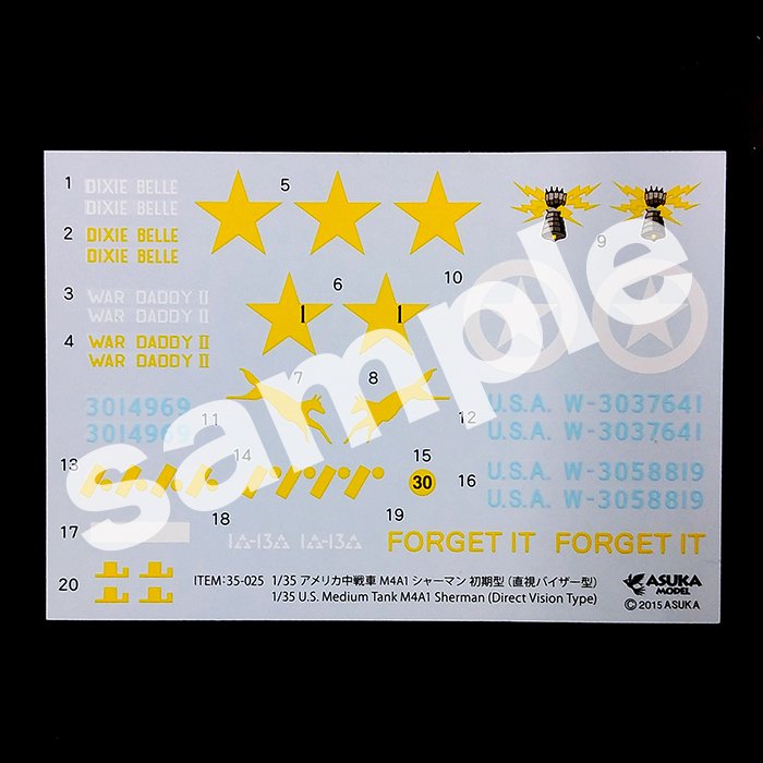 特徴的な直視バイザー付の車体上部に加え、大型サンドシールドやM3中戦車と同じ極初期型の垂直懸架サスペンション等、実戦投入されたM4A1の最も初期の姿をモデル化。収録マーキングの内、第1機甲師団第1機甲連隊第3大隊の2種は車体正面の稲妻を握る鉄拳マークを追加、側面のニックネームなども新たに判明した写真により内容を精査し、より実車に近づけました。新たに第2機甲師団第66機甲連隊のマークを追加(この部隊のマーキングは従来白とされるのが一般的でしたがカラー動画が発見され黄色であることが判明)今回新たにサスペンションの高さを固定するスぺーサー部品を追加。従来の発泡ゴムによるサスペンションの沈み込みと高さ固定式のどちらかを選択可能。スライドマークは1942年11月のトーチ作戦時の第1機甲師団第1機甲連隊2種、チュニジアからアルジェリアに移動中の第2機甲師団第66機甲連隊、イタリア戦線の計4種入り。アメリカ戦車兵のフィギュア一体付。