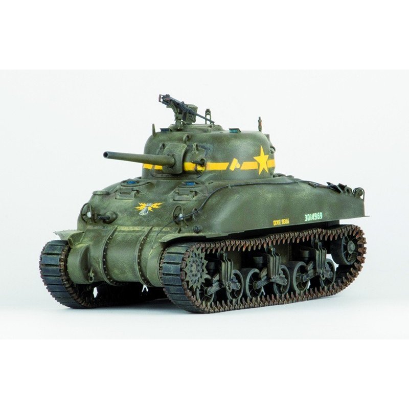 M4A1は数多く作られた75mm砲装備のM4シャーマンの中でも最初に量産化されたタイプで、M4と同じ航空機用星型エンジンを搭載、車体上部全体が鋳造製でした。初期のM4A1は、M3中戦車と同じ極初期型垂直懸架サスペンションと操縦手席前方に直視式バイザーを装備していました。ドイツアフリカ軍団に対抗するため、M4A1の直視バイザー型は量産が開始されると直ちに北アフリカのイギリス軍に配備され、1942年10月のエルアラメイン戦に投入、形勢の逆転に貢献しました。これに引き続きアメリカ軍にも配備され、翌11月のトーチ作戦の米軍主力として投入されました。上陸後の戦闘でアメリカ軍として初めてドイツ軍との直接戦闘を経験したのです。多くの犠牲を払いながらも、米軍はこの戦闘により様々な経験を得ることとなりました。この結果、直視バイザーは防御上の弱点であることが判明、これを廃止し、垂直懸架サスペンションもバネを強化した新型が登場し、M4A1も中期型へと移行していきました。チュニジア戦の後も生き残った直視バイザー型は、シシリー島、イタリア本土での戦闘に参加、終戦間際まで戦闘を続けたのです。| メーカー品番 | 35-025 |