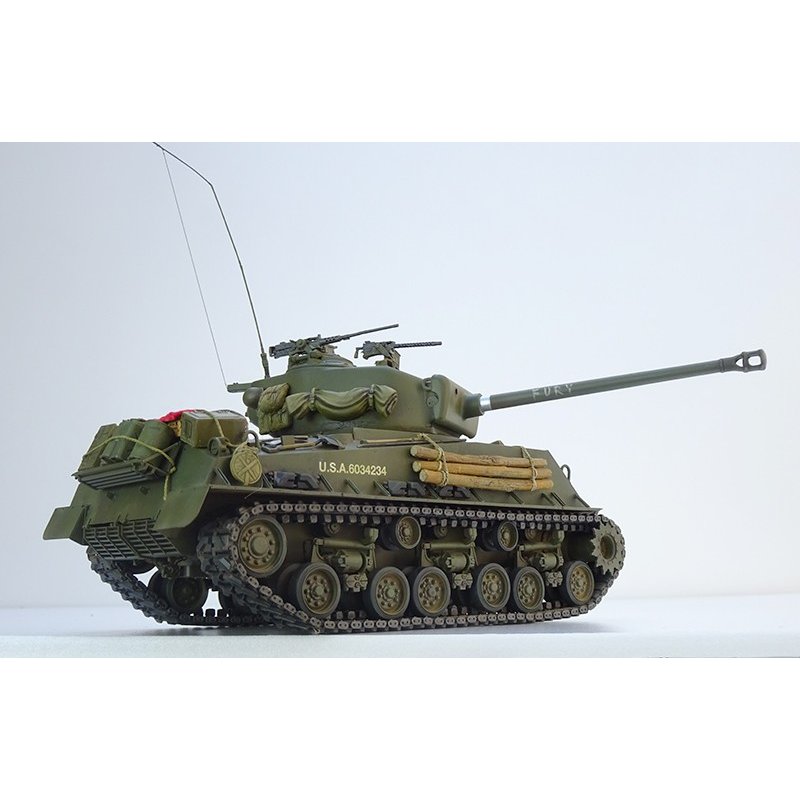 M4A3E8シャーマン”イージーエイト”幅広のキャタピラと水平懸架サスペンション(HVSS)を採用し、M4A3の76mm砲塔型の改良型とされたのがM4A3E8”イージーエイト”です。キャタピラをダブルピン・ダブルブロック式のT80型に換装し、大型化されたディフレクターや電話ボックス、救急箱、防盾基部のキャンバスカバーなどを追加して、対戦車戦闘や歩兵支援などの幅広い任務に活躍します。| メーカー品番 | 35-030 |