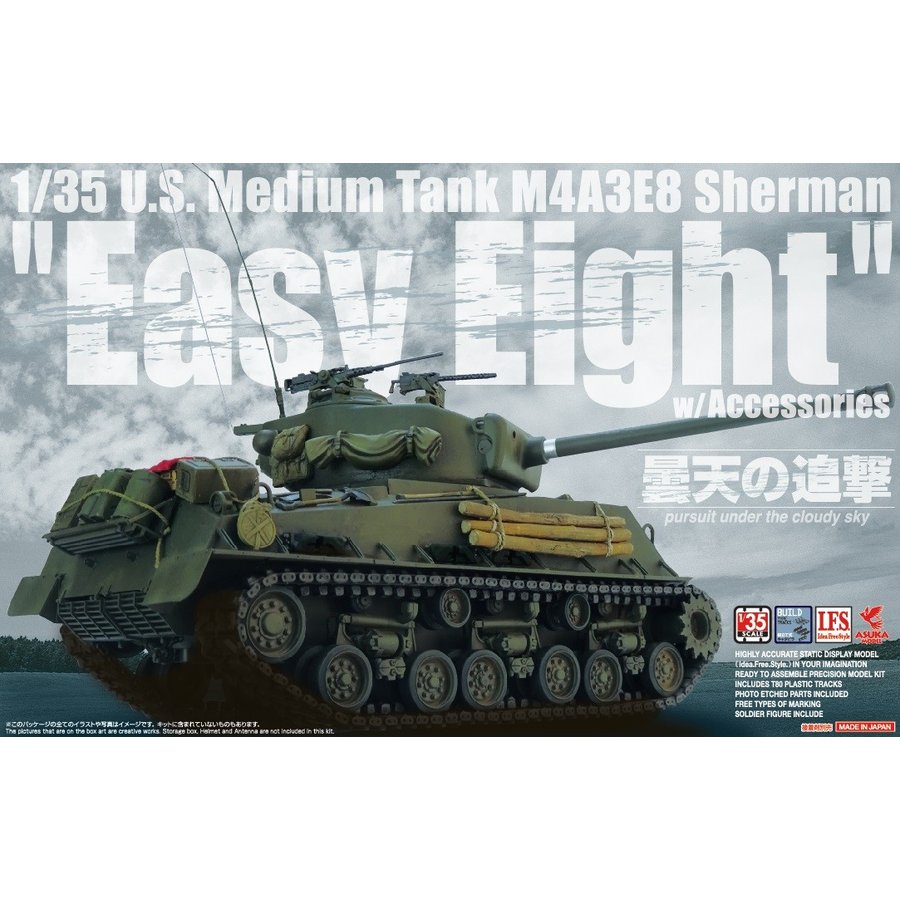 M4A3E8シャーマン”イージーエイト”の1/35スケールプラスチックモデル組立キットです。HVSSサスペンションは前後にスイングさせることができ、T80キャタピラは履板とセンターガイドを別パーツ化し立体感豊かにしました。ライトガードなどにエッチングパーツを使用。車長キューポラには透明部品を採用し、M2重機関銃、M1919A4機関銃、米軍ジェリカンの他、豊富なアクセサリーパーツを付属し、情景等、お好みのシーンを演出することができます。