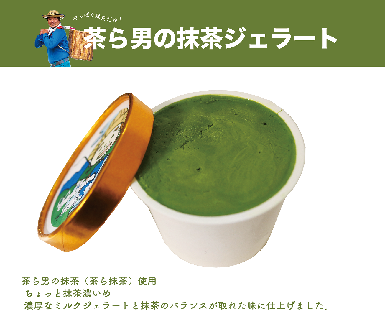 静岡県富士市のゆるキャラ「茶ら男」の力作!!非常に珍しい静岡県富士市産の抹茶(もちろん茶ら男が作っています!!)を贅沢に使用し、濃厚ジェラートに仕立てました。