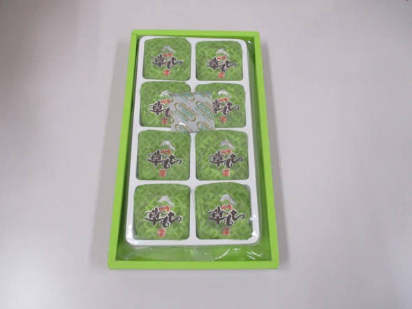 | 原材料名 | 砂糖(国内製造)、餅粉、小豆、還元水飴、よもぎ、水あめ、コーンスターチ、寒天/トレハロース、加工澱粉、増粘剤(グルテン)、(一部に小麦・乳成分・やまいもを含む) |