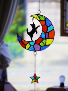 静まる ホーム > ステンドグラス工房あお > 月とネコと星のサンキャッチャー (黒ネコ)
