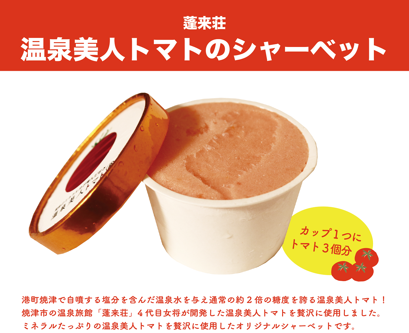 港町焼津で自噴する塩分を含んだ温泉水を与え、適度なストレスが加わる事でミネラルを多く含み、通常の1.5~2倍の糖度を誇るトマトを育てる事に成功しました。