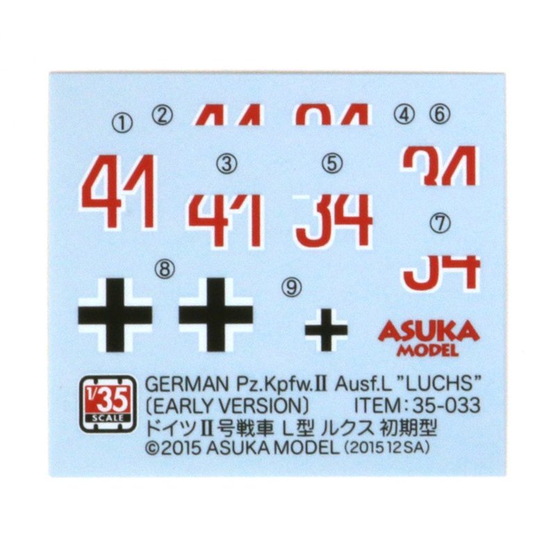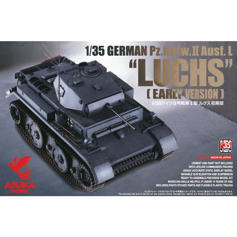 ドイツII号戦車L型ルクス初期型の1/35スケールプラスチックモデル組立キットです。ルクス初期型の特徴のひとつ、砲塔後面のハッチが幅狭のタイプをモデル化しました。初期型用アイドラーホイールも付属。ロールアウト時の、大戦前半でドイツ戦車で見られたジャーマングレーに塗装されたルクスの姿を作ることができます。
