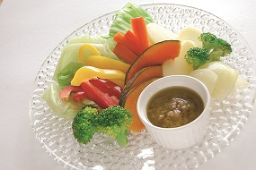 <かつお塩辛ソース>かつおの腸を塩で慣らした保存食品で、旨味がありますが、塩辛い為、食べやすいようにバーニャカウダ風のソースにしました。