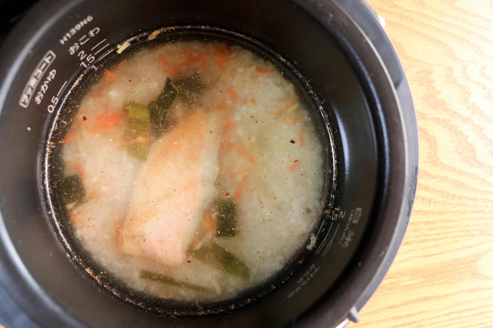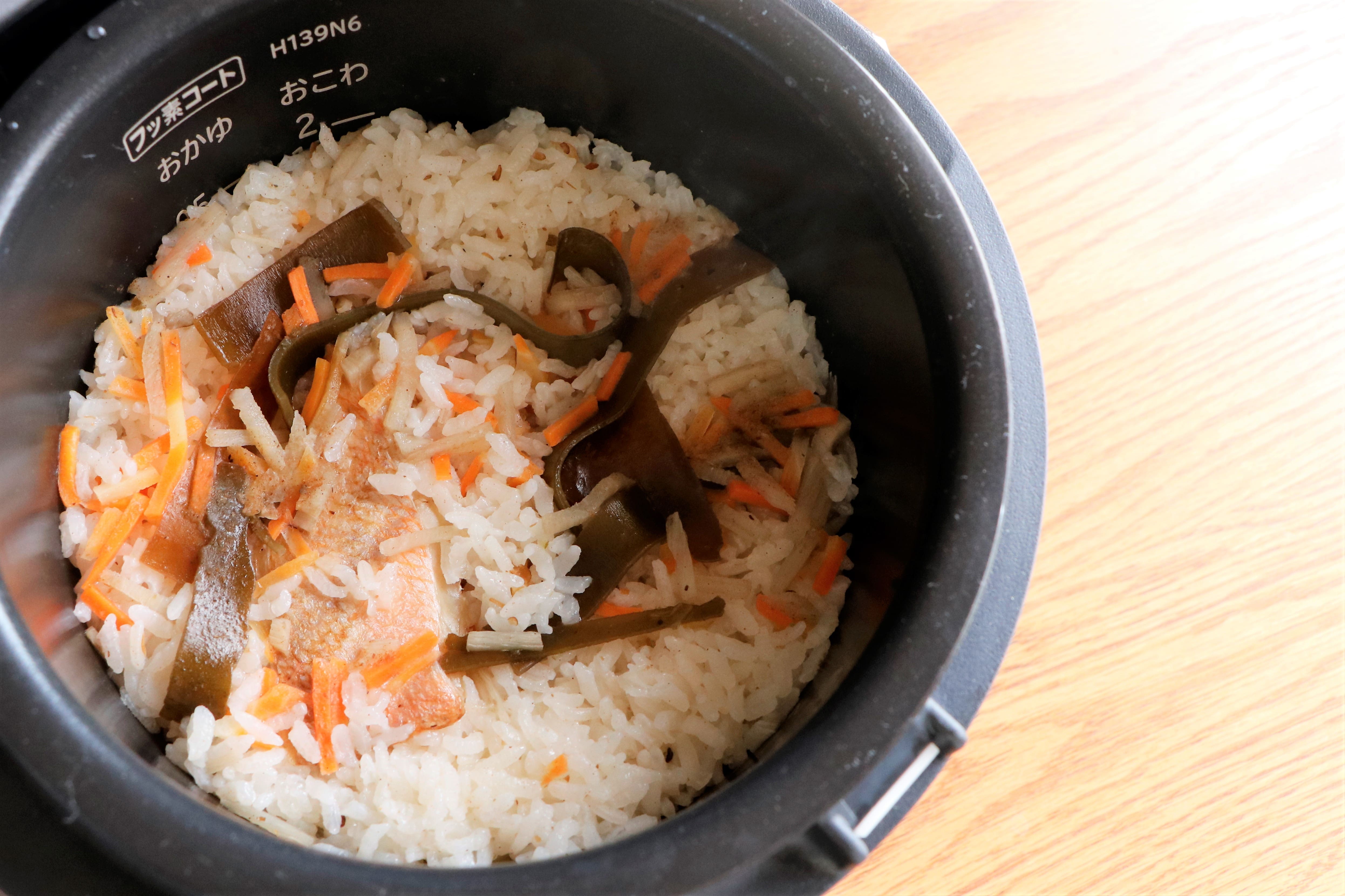 ①だし入りのお米を、洗わずに炊飯器に入れます。②1合分の水加減まで水を入れ、混ぜあわせます。