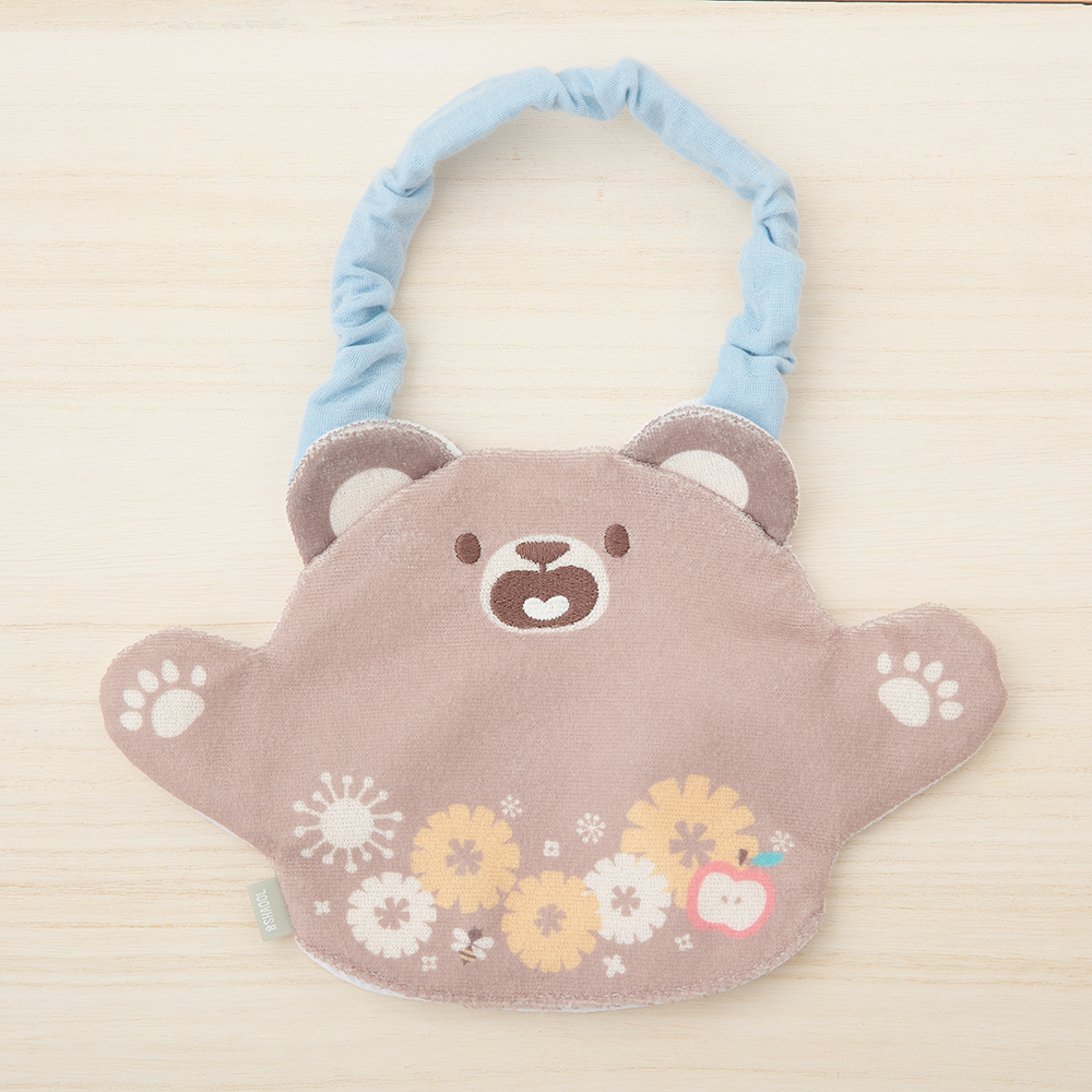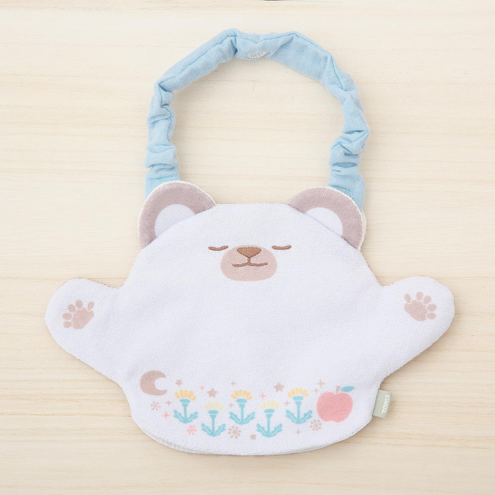 通常のスタイとしての使い方だけでなく、ポケット部分に手を入れ、遊びにも使えるようにしました。紐を外すこともでき、表と裏の表情の違いを活かした「いないいないばぁあそび」や「パペットあそび」も楽しめます。リバーシブルなので、その日の服に合わせて好きなデザインを選べます。