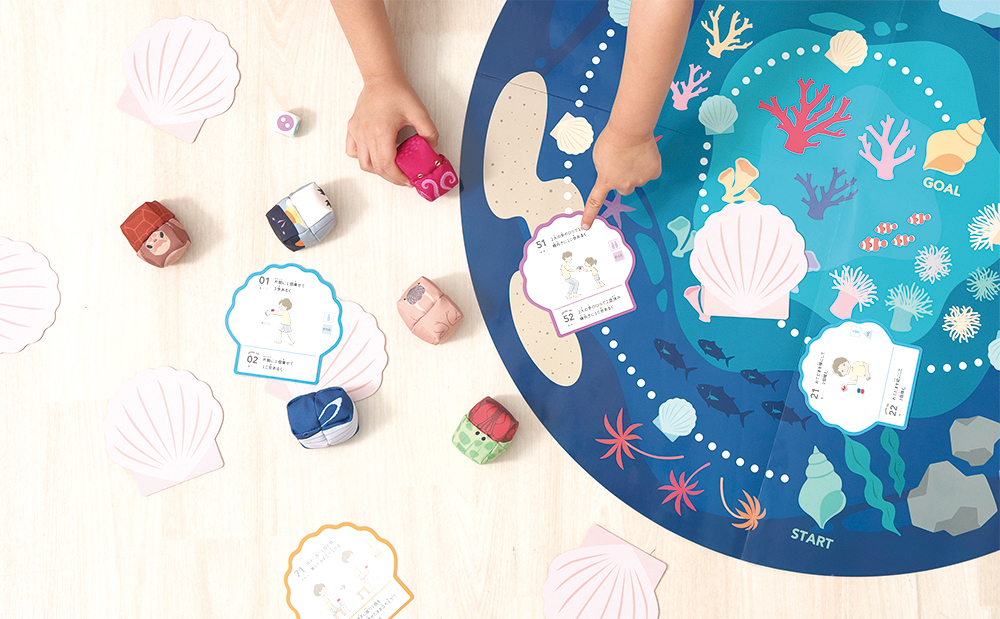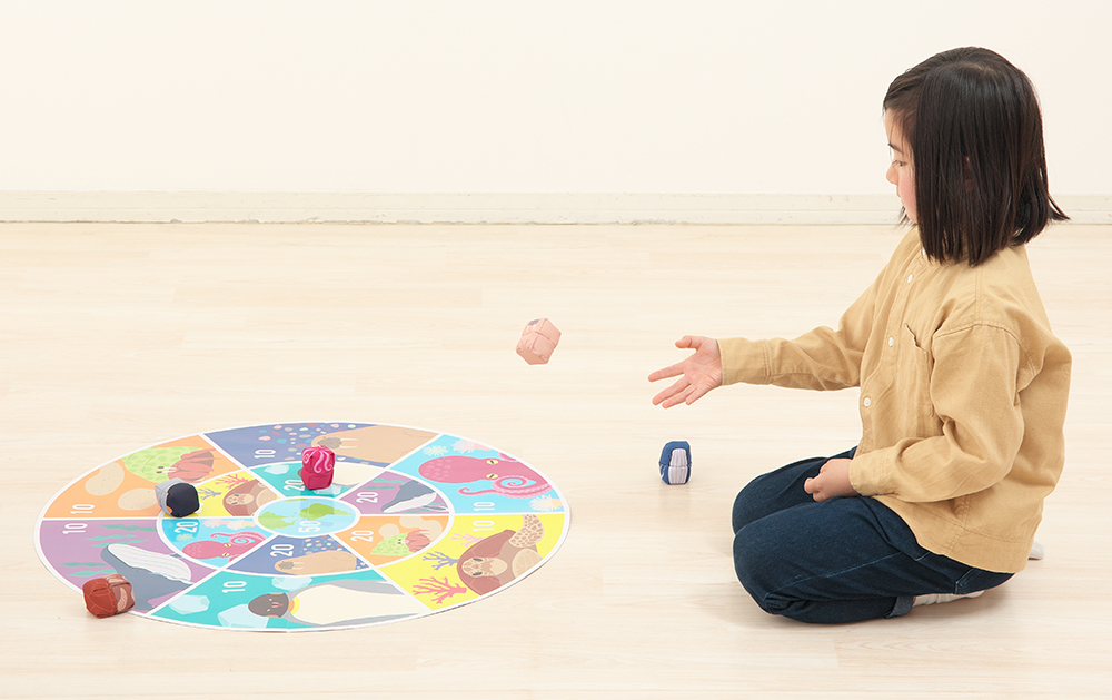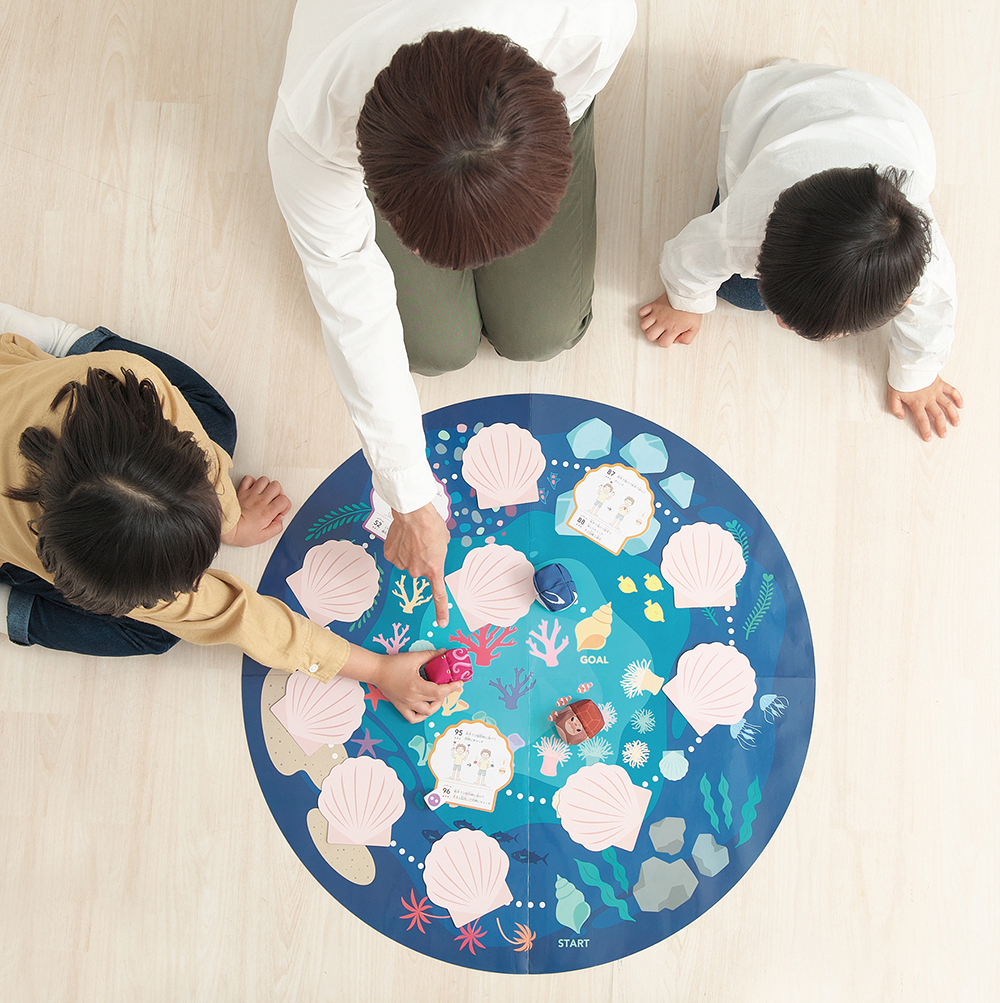 ファミリーおてだまSEA WORLDは、古き良きお手玉遊びに新たな要素をプラスし、家族や友達みんなで楽しむことができる現代版お手玉です。50枚のカードには、おてだまを使った100種類の技を収録。投げて取る、と言う基本の動きに加え、体に乗せてバランスを取ったり2人で協力して技を完成させたりと、バリエーション豊かな技に挑戦できます。さらに「すごろくあそび」と「まとあてあそび」ができるシートが付属されていて、遊びが広がります。